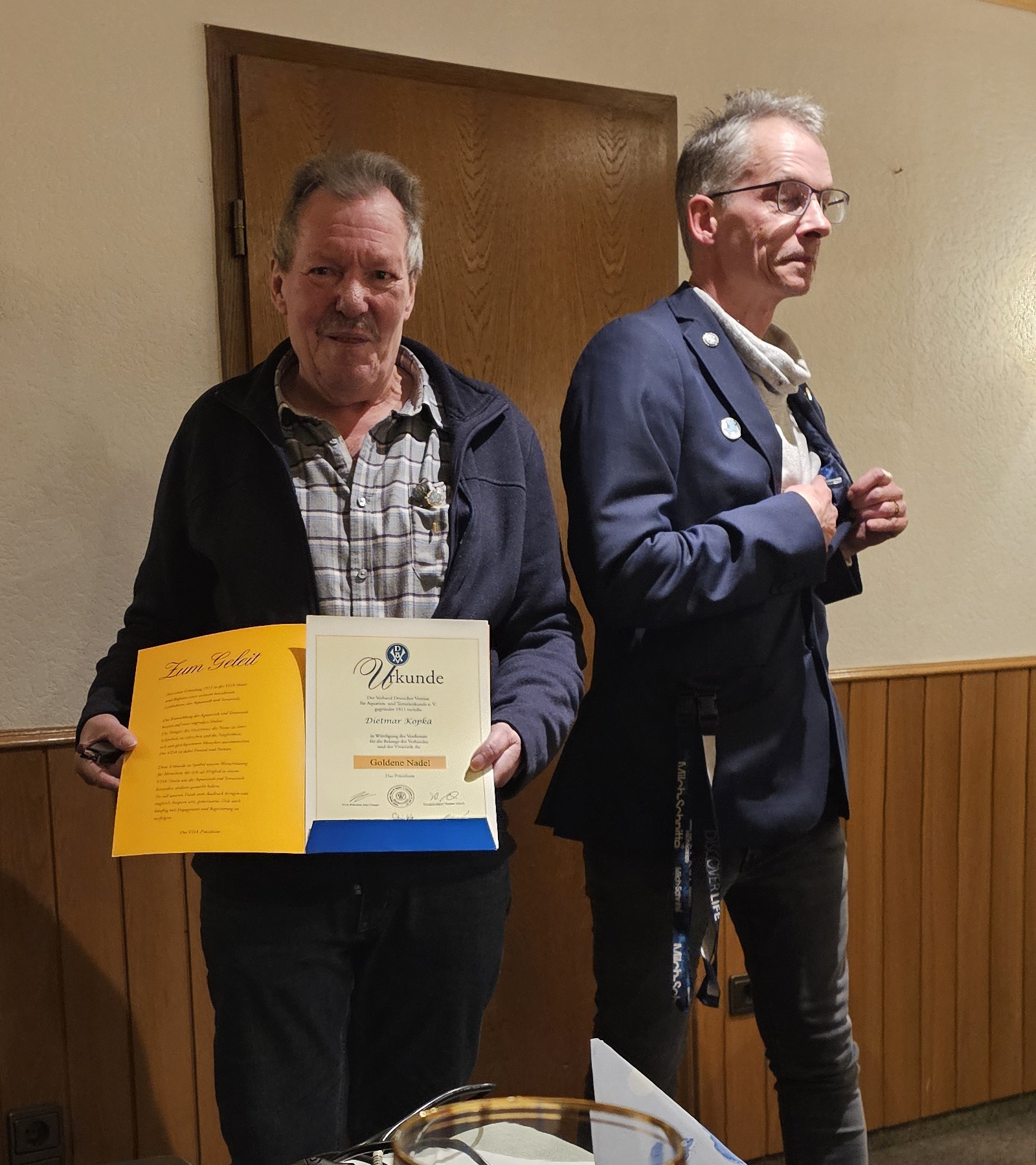 Außerdem verlieh Herr Bonack unserem Gründungsmitglied Dietmar Kopka die Goldene Ehrennadel des VDA für seine 40 jährige erfolgreiche Vereinstätigkeit im Vorstand und als Börsenwart.